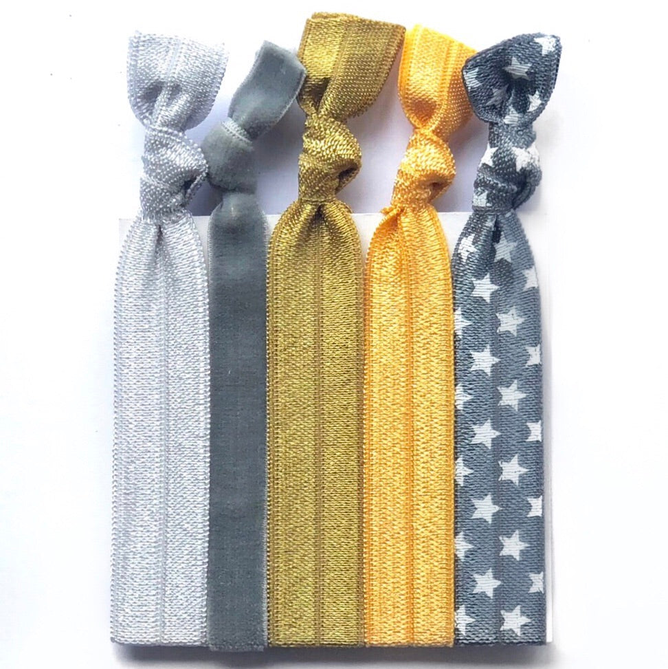 5 knotted elastic hair ties.
