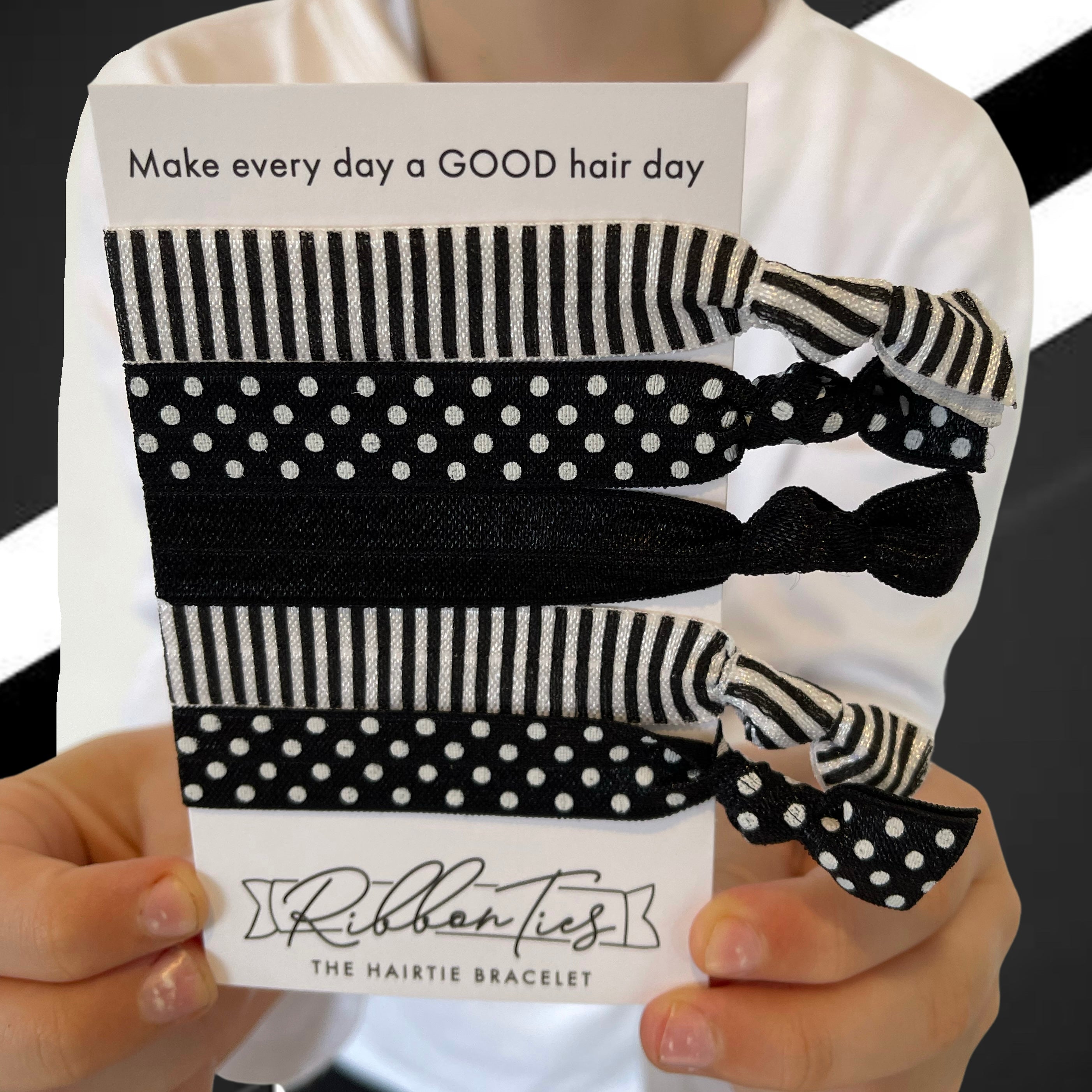 RibbonTies are handmade from a soft and stretchy elastic that provide a comfortable, all day hold. Our hair ties are kind on your hair and cute on your wrist and are a great accessory for your fashion ensemble.