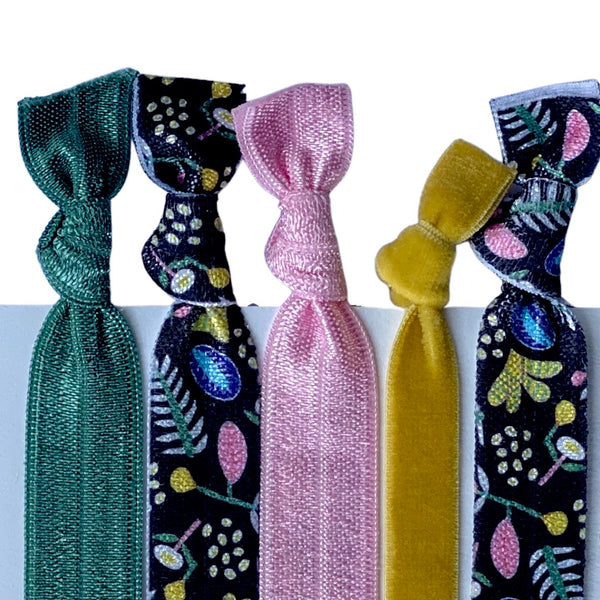 5 knotted elastic hair ties.