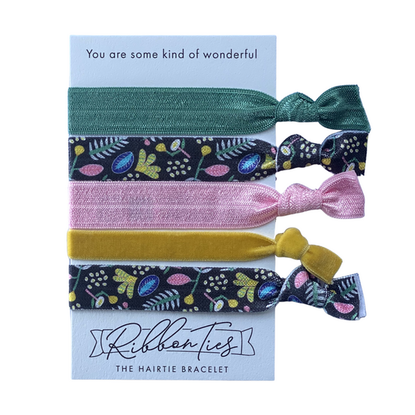 RibbonTies are handmade from a soft and stretchy elastic that provide a comfortable, all day hold. Our hair ties are kind on your hair and cute on your wrist and are a great accessory for your fashion ensemble.